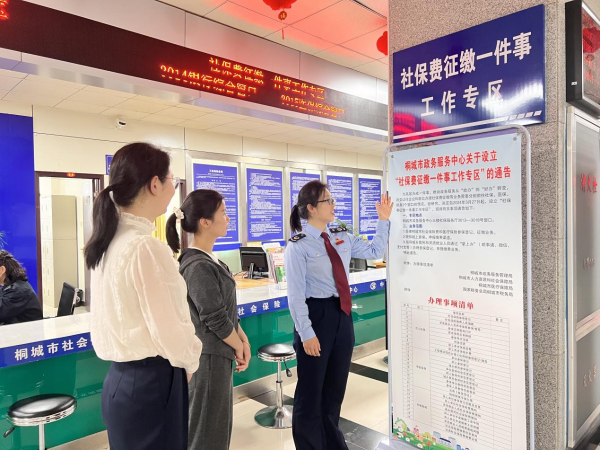 三个部门并联窗口,沟通协作更高效。桐城市税务局办税服务厅负责人吴文兵介绍说:“近年来,聚焦社保费办理‘多头跑’‘来回问’等堵点痛点问题,税务部门一直与社保、医保部门积极探索跨部门联动机制。此次设立‘社保费征缴一件事工作专区’,打造社保费业务‘专区联办’便民新模式,缴费人只需在一个窗口,就可以一次性办理参保登记、费种申报、缴费、证明开具等多项跨部门业务,真正实现了一窗受理、内部流转、一次办结。”