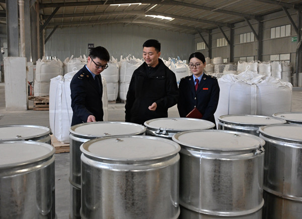 安徽省明光市是全国三大凹凸棒石黏土矿区之一,凹凸棒基新材料产业集群是该市特色产业。近期,国家税务总局明光市税务局组织税务干部走进凹凸棒新材料产业园,为相关企业辅导涉税政策,提示涉税风险。图为税务干部日前在园区了解企业生产情况。