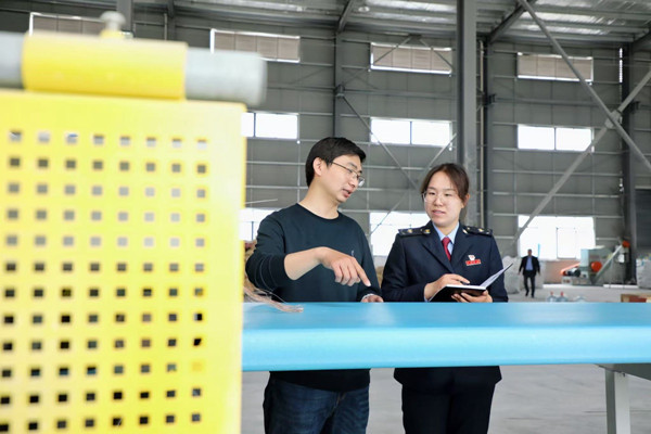 国家税务总局来安县税务局根据辖区内高科技企业经营实际和涉税需求,组织税务干部走进企业了解生产经营情况,核实企业相关帐务,提示涉税风险点。图为该局税务干部近日在一家节能科技企业走访。