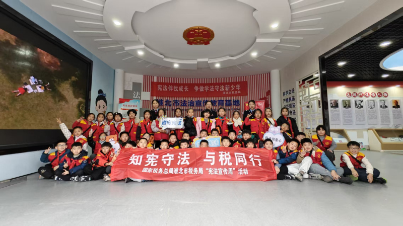 在法治宣传教育基地,联合市税务局组织小学生化身“小记者”,开展“知宪守法 与税同行”宪法宣传活动,学习宪法知识和税法常识,开设互动答题环节,在寓教于乐中让法治精神浸润童心。